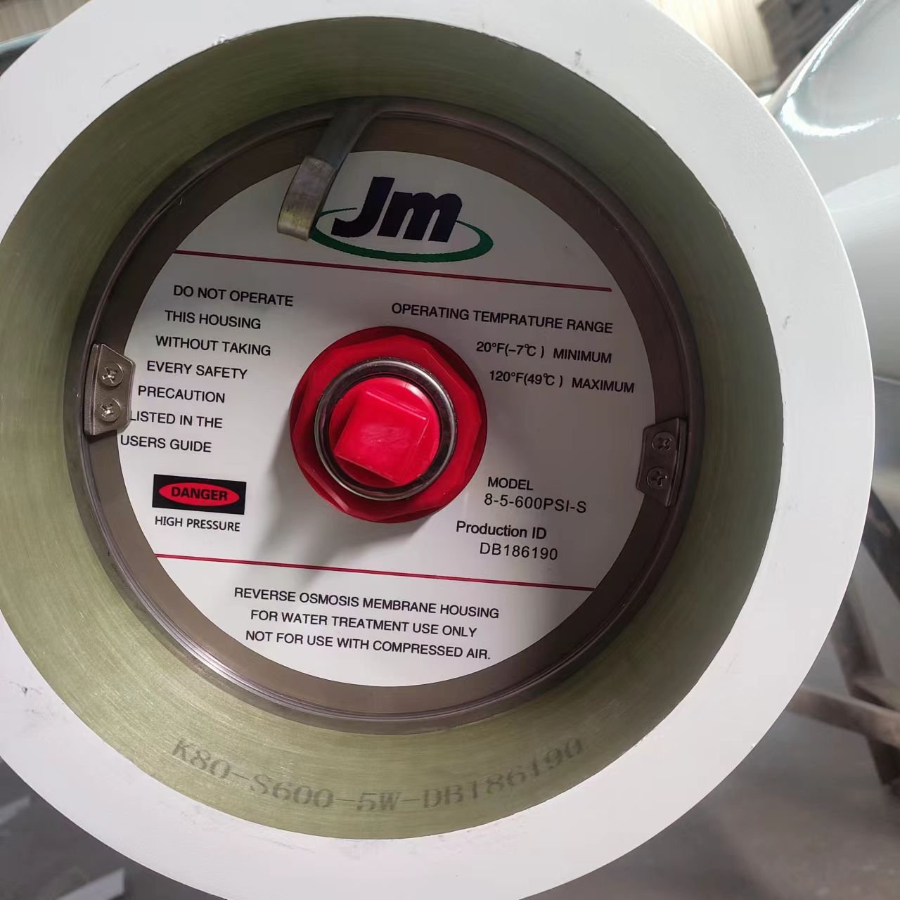 Shell / Body | Cylindrical, high-pressure vessel made from fiberglass-reinforced plastic (FRP) |